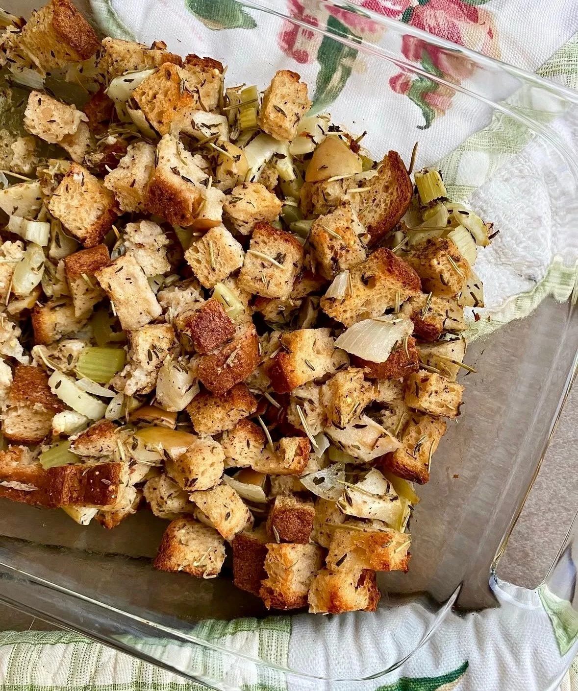 Grease a baking dish and add the stuffing mixture, spreading to make it an even layer. 6) Bake for 40-45 minutes, until the top is slightly brown.
