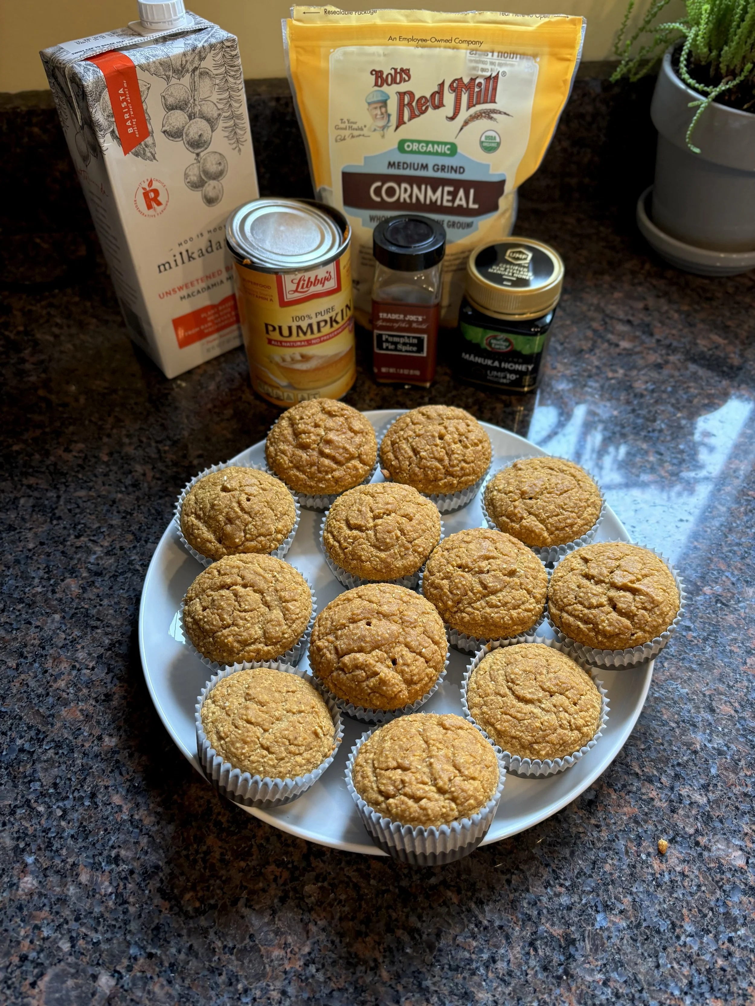 Preheat oven to 350°F and line a muffin tray with liners or grease well. 2) In a large bowl, whisk together the egg, pumpkin, honey, and milk.