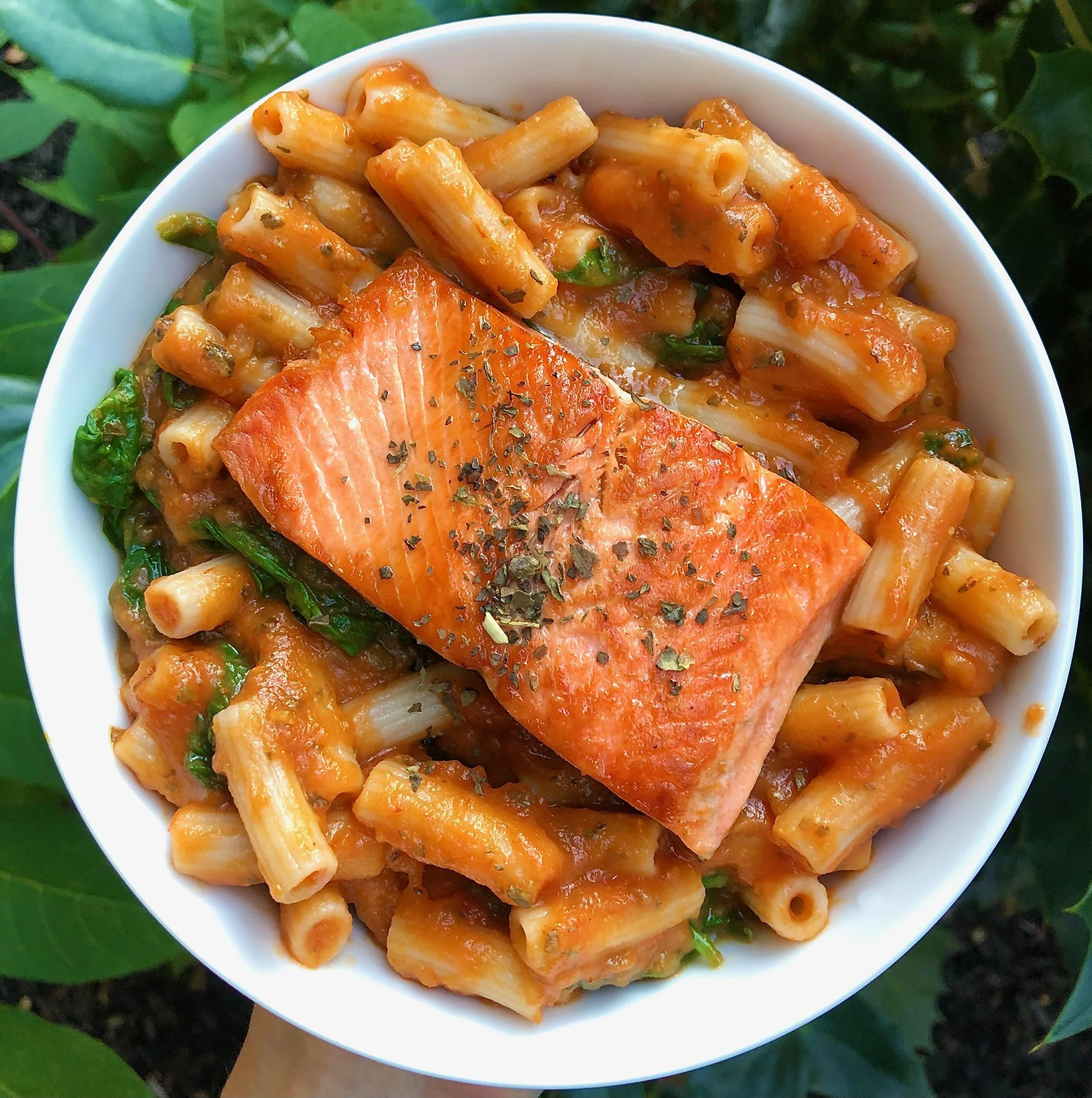 Add the pasta to a bowl, top with the cooked salmon, and garnish with more basil.
