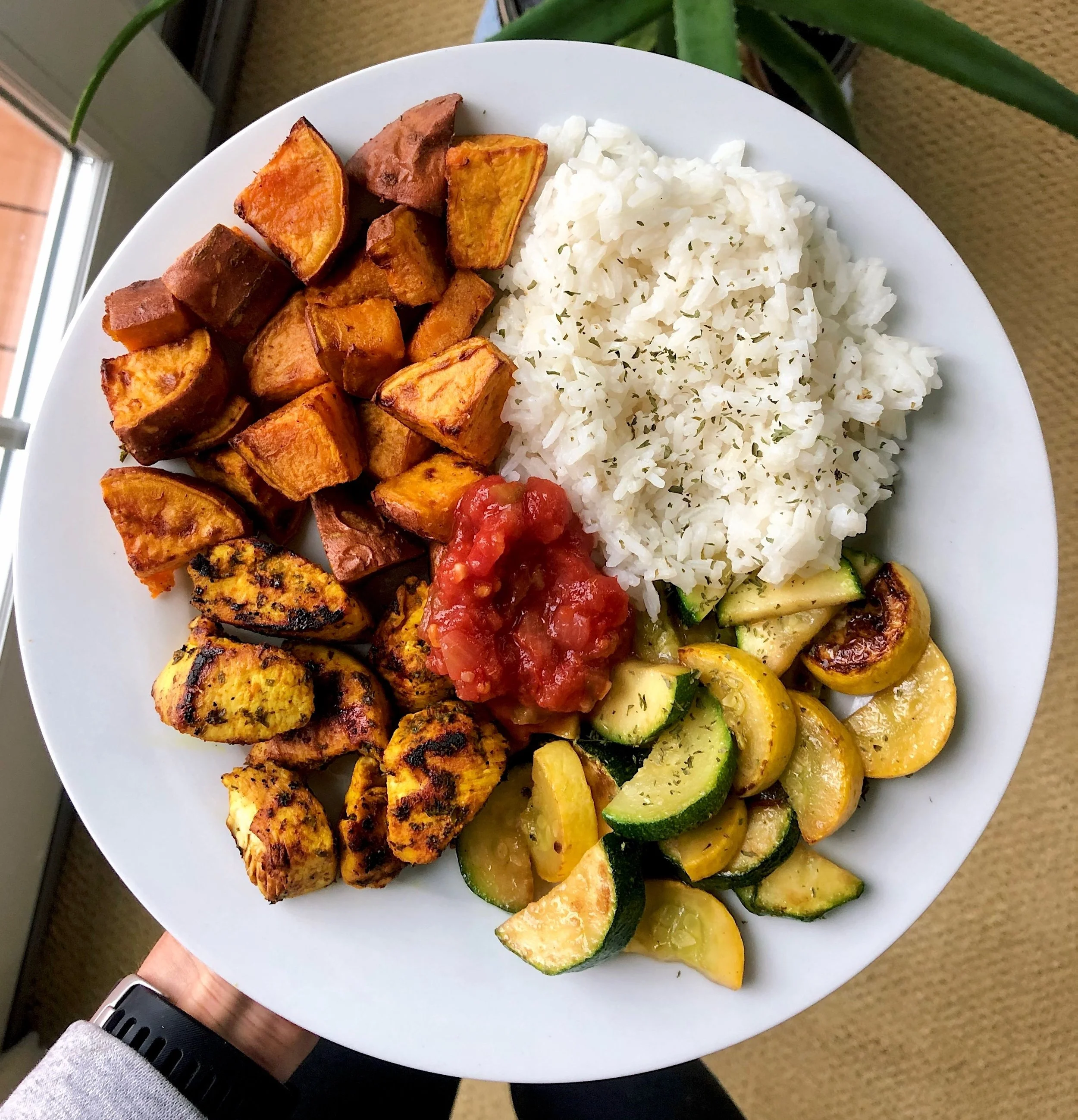 Assemble the plate: add the rice, sweet potatoes, chicken, and zucchini to the plate, and top with your favorite salsa (or other sauce).