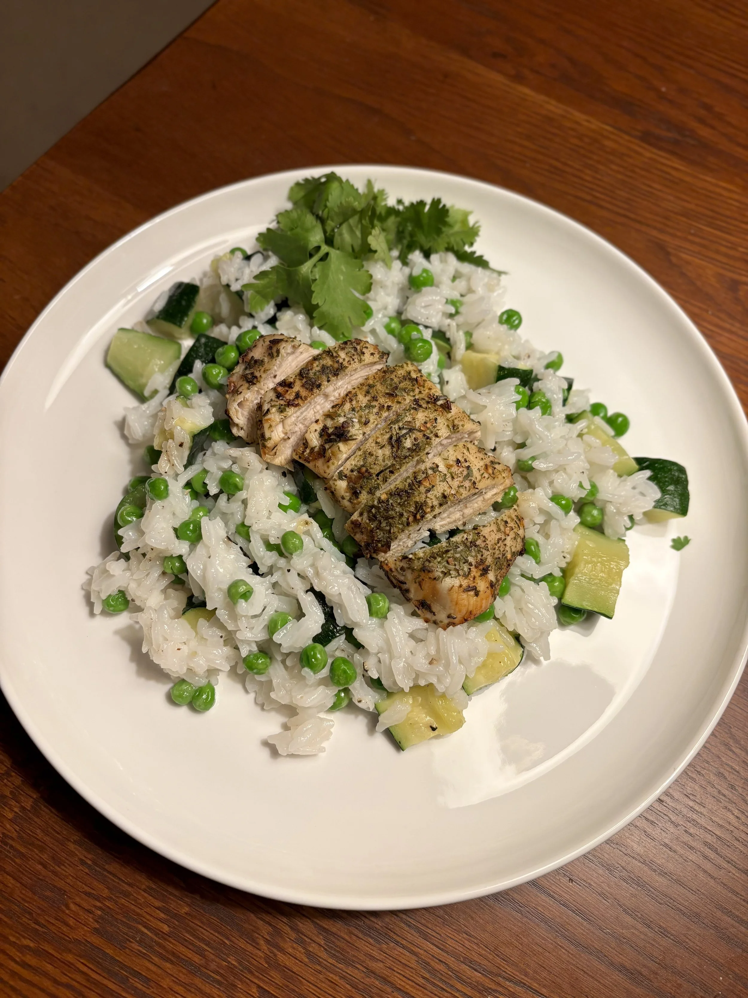 To assemble: mix the peas and zucchini into the cooked rice, along with a spoonful of coconut oil, some sea salt and fresh cilantro. Top with the chicken and more fresh cilantro.